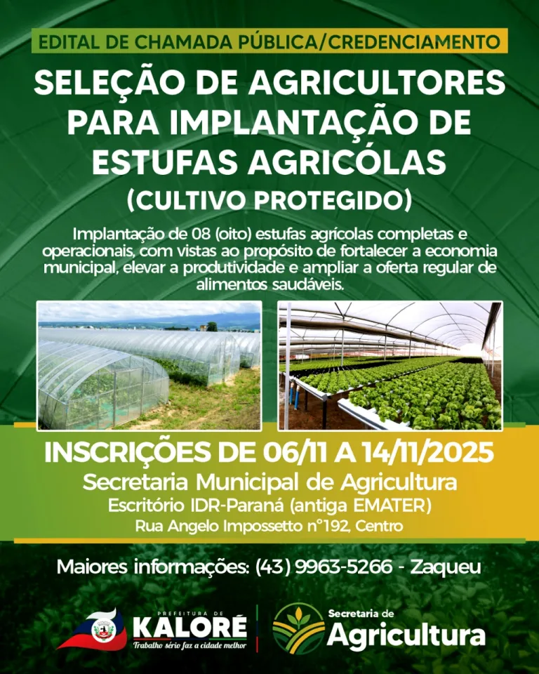 Kaloré abre seleção de agricultores para implantação de estufas agrícolas no município 7 de novembro de 2025