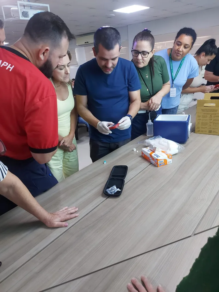A enfermeira Edinalva de Moura explica que o Sistema de Monitoramento VERI-Q Hb Mate é utilizado para a mensuração quantitativa da hemoglobina e do hematócrito em amostras de sangue total capilar, utilizando um analisador e tiras de teste especialmente projetados. A enfermeira Mércia de Paula e Cacilda do Prado (epidemiologia), ressaltaram contudo que o fluxograma do Ministério da Saúde, para o Manejo Clínico da Dengue, traz como obrigatoriedade a realização do exame hemograma completo, em alguns casos específicos.