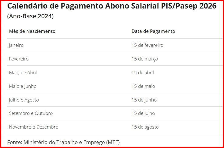O pagamento do abono salarial PIS/Pasep 2026, referente ao ano-base 2024, começa dia 16 de fevereiro.