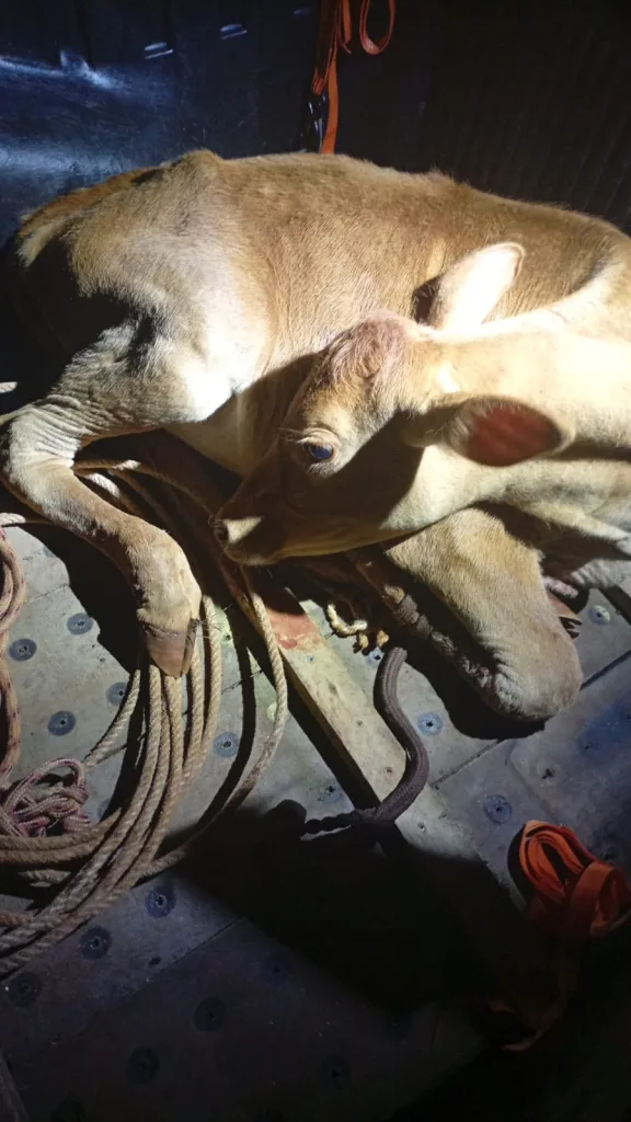 Na picape estavam o condutor, um homem de 25 anos, e um passageiro, de 28 anos. Durante a vistoria, os policiais encontraram uma bezerra amarrada no compartimento de carga, sem condições mínimas de segurança e bem-estar, o que configura maus-tratos. A dupla afirmou ter negociado o animal no mesmo dia com os ocupantes do Corsa e mostrou mensagens de celular sobre a suposta transação.