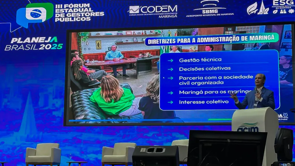 Representando o prefeito Rodolfo Mota, o secretário municipal de Assuntos Estratégicos e da Indústria, Comércio, Serviços e Emprego da Prefeitura de Apucarana, Emerson Toledo Pires, participou nesta terça-feira (21/10), no Centro de Eventos Paraná Expo, em Maringá, do III Fórum Estadual de Gestores Públicos – Etapa Planeja Brasil 2025, uma realização da Paraná Projetos, da Secretaria de Planejamento do Governo do Estado. “Trata-se de um evento que reúne especialistas, planejadores urbanos, gestores públicos e representantes da sociedade civil para debater políticas e estratégias que impulsionem o desenvolvimento socioeconômico e sustentável dos municípios paranaenses”, explicou Toledo.