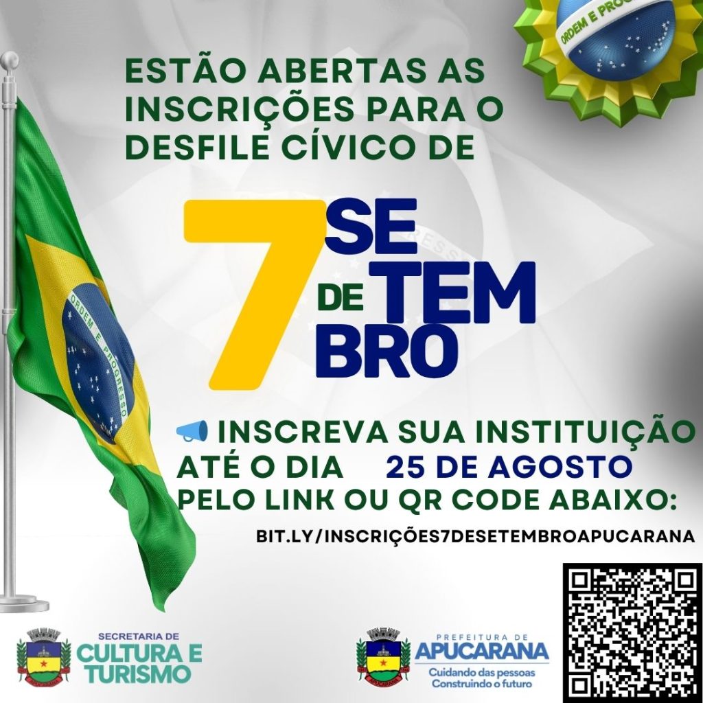 A Secretaria Municipal de Cultura e Turismo de Apucarana informa que estão abertas as inscrições para o desfile cívico de 7 de setembro. As instituições interessadas têm até o dia 25 de agosto para confirmar a presença, efetivando cadastro presencialmente no Cine Teatro Fênix (Av. Curitiba, 1.215 – Centro), ou por meio de formulário online disponível no link http://bit.ly/inscrições7desetembroapucarana.