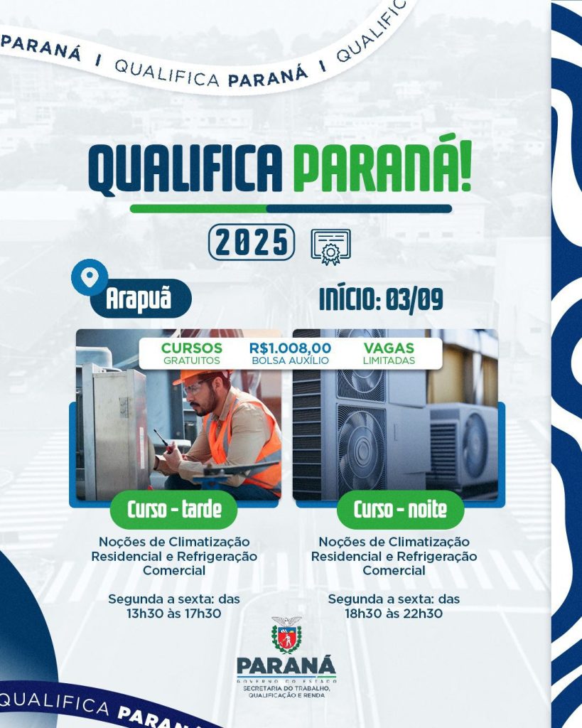 A Prefeitura de Arapuã anunciou, nesta quarta-feira (13 de agosto), a abertura das inscrições para o curso gratuito de Noções de Climatização Residencial e Refrigeração Comercial, oferecido pelo programa Qualifica Paraná. As aulas começam no dia 3 de setembro e serão realizadas de segunda a sexta-feira, com duas turmas: no período da tarde, das 13h30 às 17h30, e à noite, das 18h30 às 22h30.