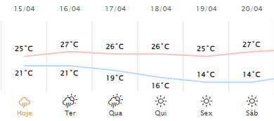 Para terça-feira (16) a previsão é de 12 milímetros de chuva, com variação de 21°C a 27°C na temperatura.