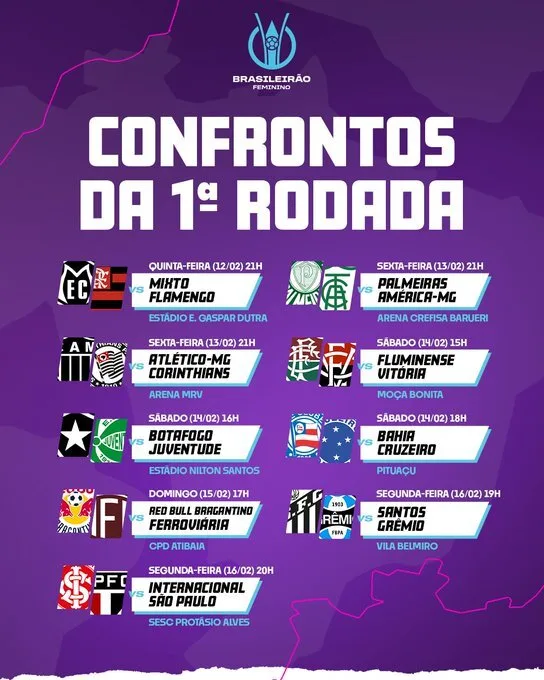 Série A1 (primeira divisão) do Campeonato Brasileiro Feminino de Futebol 2026 começa daqui a oito dias e já tem datas, locais e horários das partidas das primeiras 10 rodadas. A tabela detalhada do torneio foi divulgada nesta quarta-feira (4) pela CBF. O jogo de abertura será entre Mixto-MT e Flamengo, no dia 12 de fevereiro (uma quinta), às 21 h (horário de Brasília), no Estádio Eurico Gaspar Dutra, em Cuiabá. O heptacampeão Corinthians estreia um dia depois, fora de casa, contra o Atlético-MG, que retorna este ano à elite do futebol feminino..