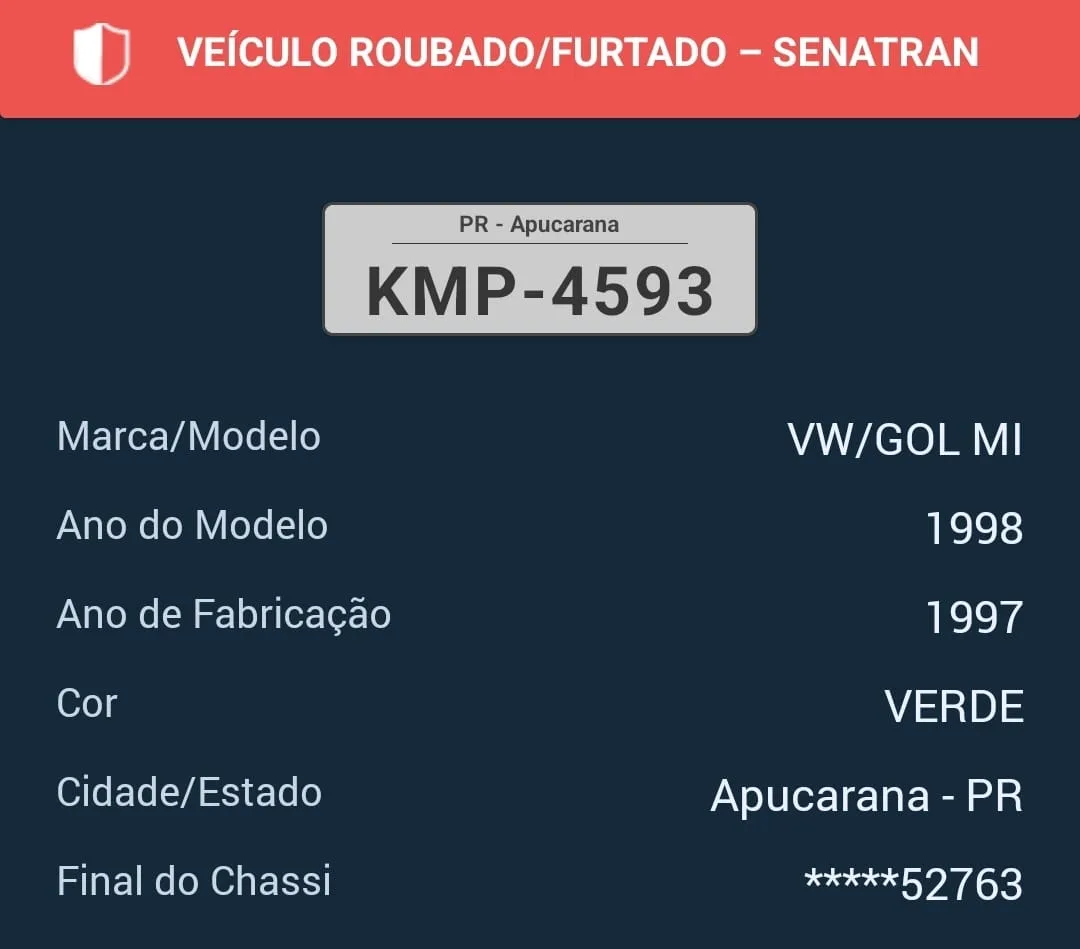 Um veículo VW Gol G2, de cor verde e placas KMP-4593, foi alvo de furto neste domingo (30), em Apucarana. O crime foi registrado pela Polícia Militar por volta das 17h10, na Avenida Rafael Sorpile, no Núcleo Habitacional Dom Romeu Alberti.
