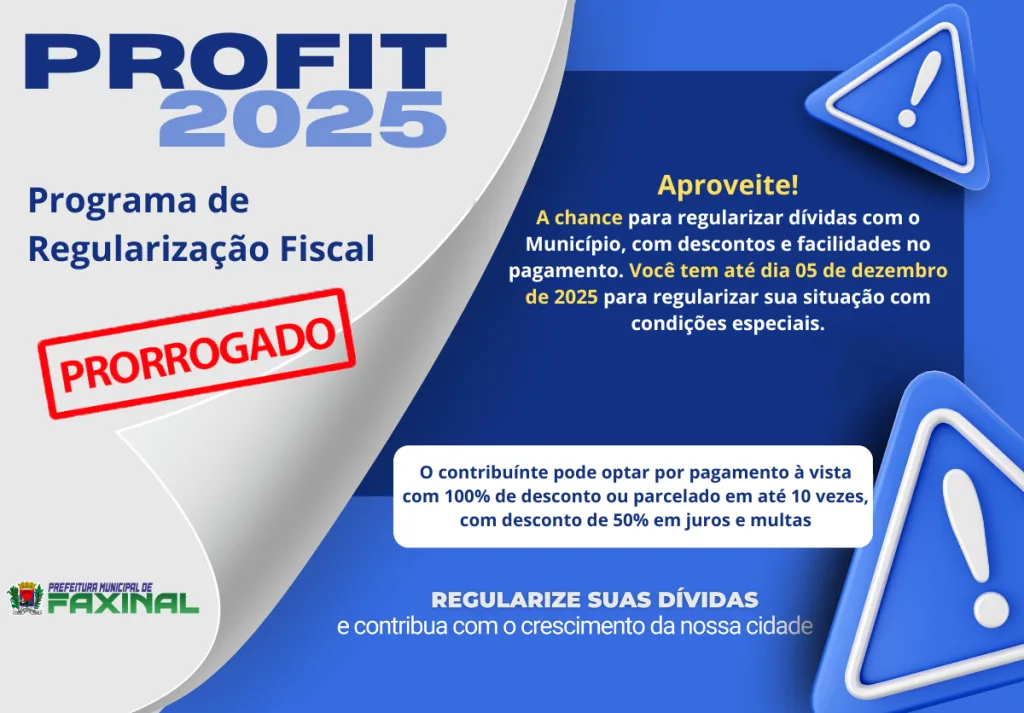 PROFIT – Programa de Regularização Fiscal tem prazo prorrogado até 5 de dezembro em Faxinal 31 de outubro de 2025