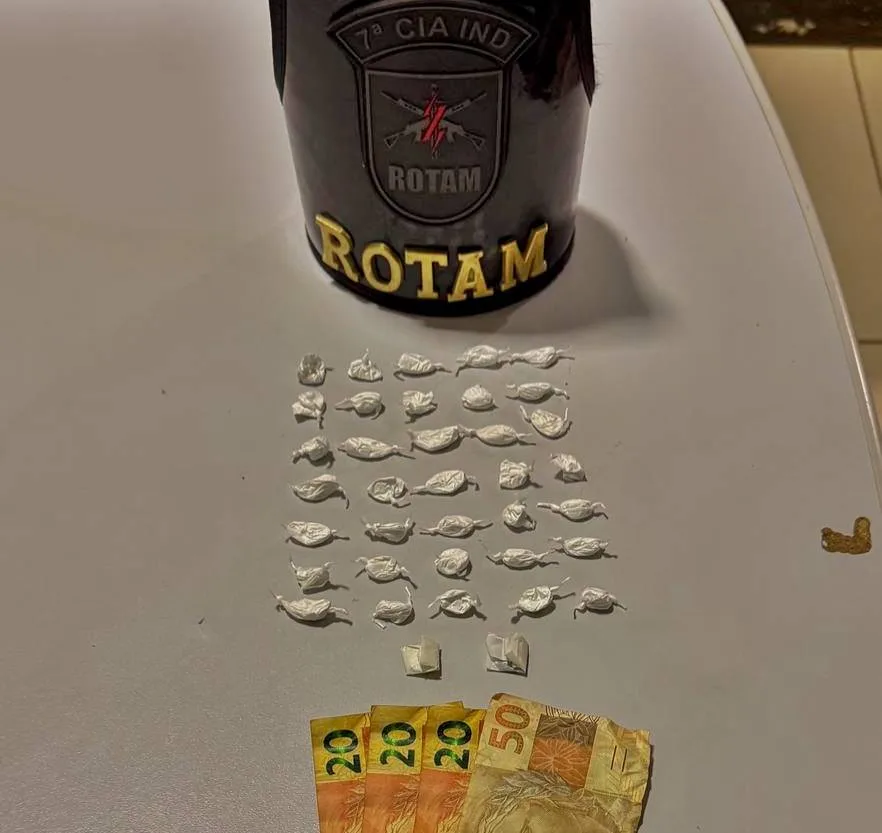 Em outra ação, a equipe ROTAM prendeu um homem após denúncia de venda de drogas em um bar. Na abordagem, os policiais encontraram porções de haxixe e dinheiro com o suspeito.