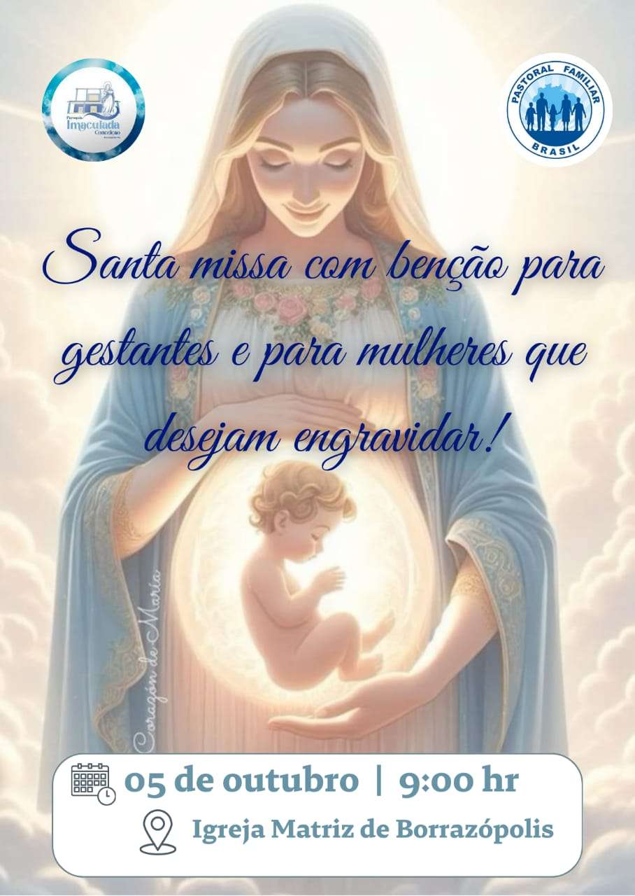 A Paróquia Imaculada Conceição, em comunhão com a Pastoral Familiar, convida todas as gestantes e mulheres que desejam engravidar para participarem de uma Santa Missa com bênção especial, a ser realizada no dia 05 de outubro, às 9h, na Igreja Matriz de Borrazópolis.
