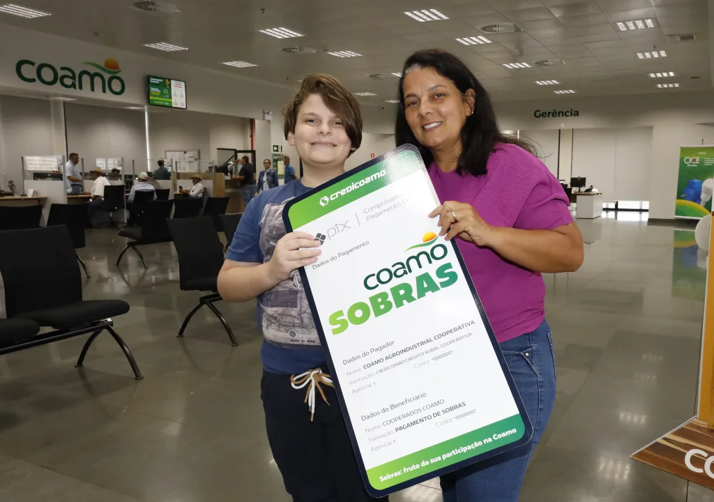 A cooperada Patrícia Aparecida Santiago, também de Campo Mourão, utilizará o valor recebido para organizar as despesas familiares. “Eu vou adiantar umas parcelas da escola das crianças e fazer umas comprinhas de natal”, comenta. Ao lado do filho, Enzo, ela avalia que as sobras trazem previsibilidade ao planejamento financeiro. “É uma segurança. Você sabe que no final do ano vai receber uma sobra e consegue se programar.”