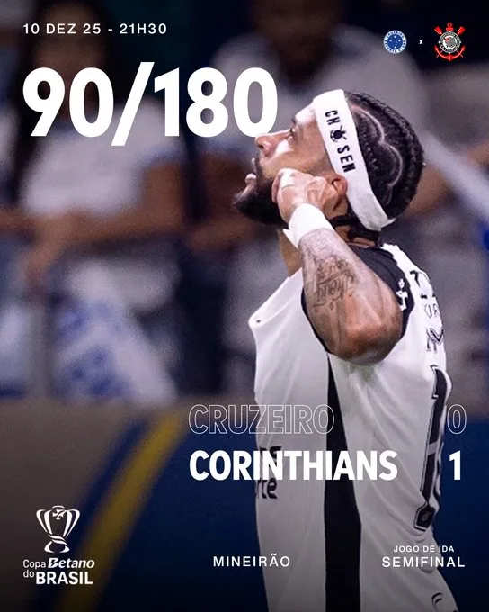 A equipe comandada pelo técnico Dorival Júnior ativou o modo copeiro e entrou no gramado do Mineirão em ritmo acelerado, assumindo o comando das ações. E a primeira boa oportunidade do confronto foi criada justamente pelo Corinthians, quando Memphis Depay cobrou escanteio fechado e obrigou Cássio a fazer uma difícil defesa aos cinco minutos.