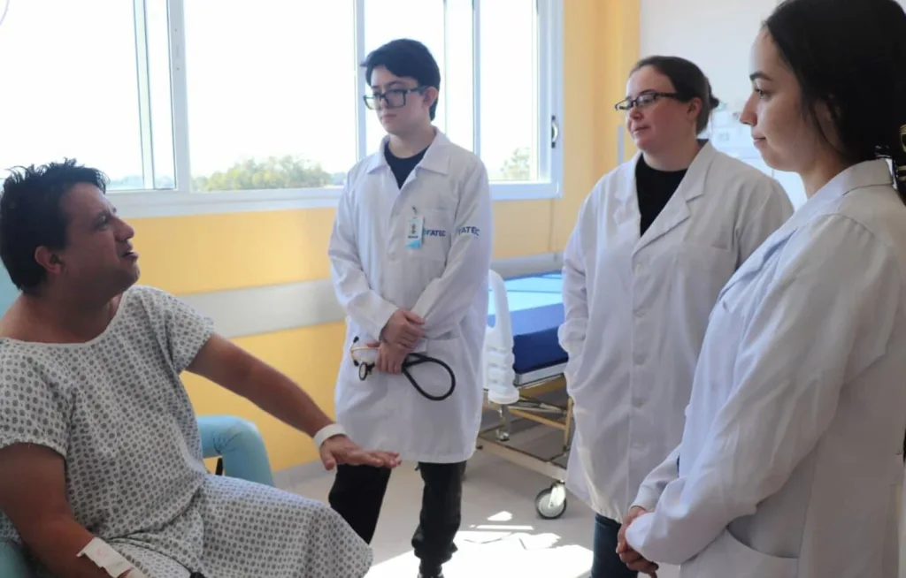 Um grupo de acadêmicos de Medicina da Fatec Ivaiporã caminha de jaleco branco e em silêncio pelo corredor do Hospital Regional. Está aprendendo a ouvir. Antes de exames ou diagnósticos a formação começa no diálogo.