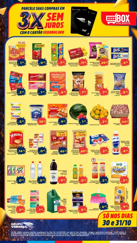 Além de tudo isso, o Box Atacadista oferece pagamento facilitado em até 3x sem juros com o Cartão Veronacard — pra você aproveitar o máximo de descontos sem pesar no bolso.