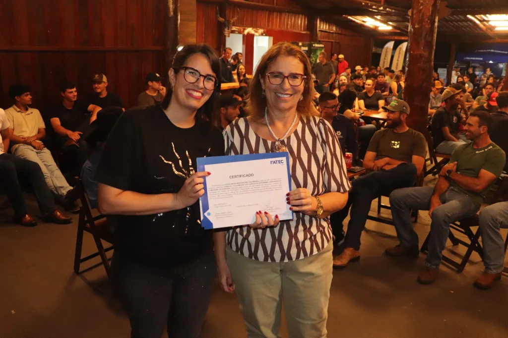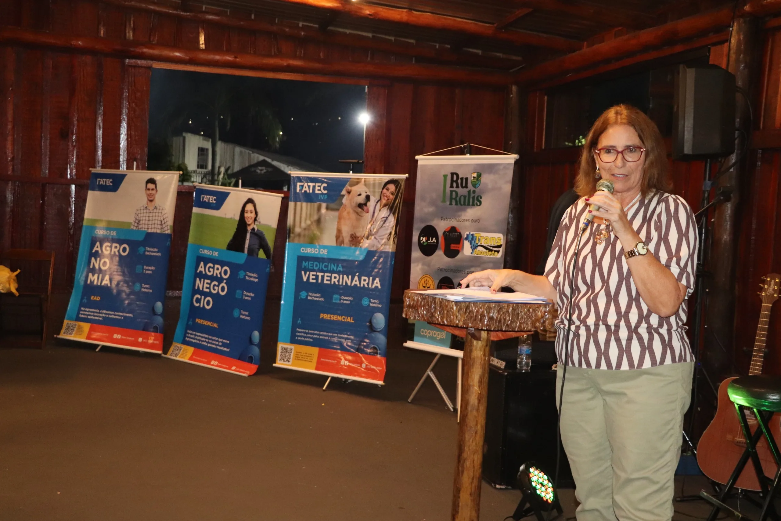 Vitória Holzmann também citou a trajetória na Fatec Ivaiporã, onde coordenou o curso de Agronegócio por 5 anos, e contou que sempre quis trabalhar com equinos. “Acabei na extensão rural. O mundo dá voltas! O importante é levar respeito ao produtor rural, às lideranças e aos professores, porque é o que sustenta o desenvolvimento do campo”, disse.