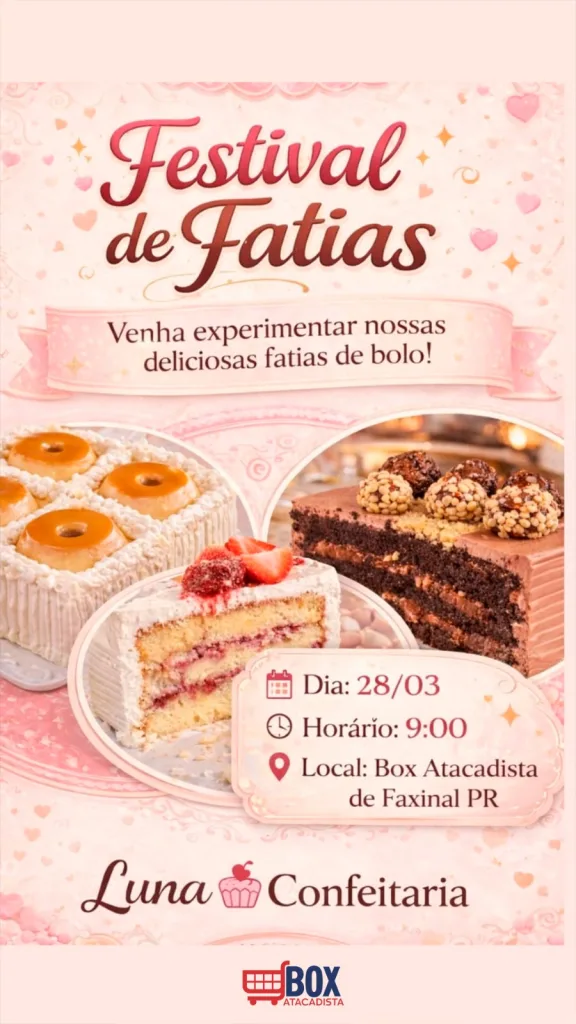 O Box Atacadista de Faxinal realiza, neste sábado (28), o “Festival de Fatias”, uma iniciativa que abre as portas da unidade para destacar o talento local e apoiar o empreendedorismo feminino. O evento contará com a presença da Luna Confeitaria, apresentando produções artesanais aos clientes da loja.