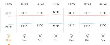 O domingo (15) tem previsão semelhante, de dia ensolarado, com poucas nuvens e temperatura variando de 21°C a 31°C.