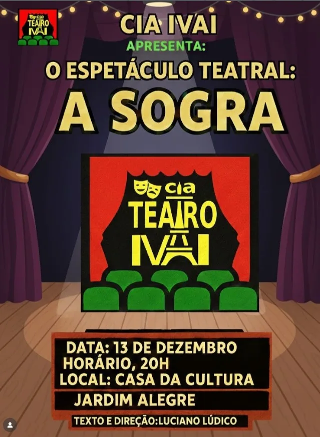 A Casa da Cultura de Jardim Alegre receberá no dia 13 de dezembro, às 20h, o espetáculo teatral “A Sogra”, apresentado pela Cia Ivaí. A peça, escrita e dirigida por Luciano Lúdico, é uma comédia que aborda situações do cotidiano com humor e promete atrair público de diferentes faixas etárias.