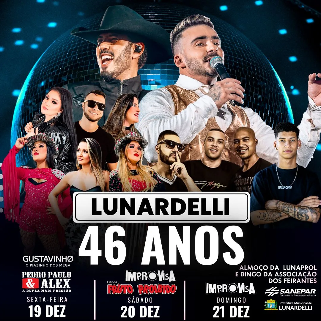 A Prefeitura de Lunardelli anunciou a programação oficial das comemorações pelos 46 anos de emancipação política do município. As atividades acontecerão entre os dias 19 e 21 de dezembro, com eventos culturais, apresentações musicais e ações promovidas por associações locais.
