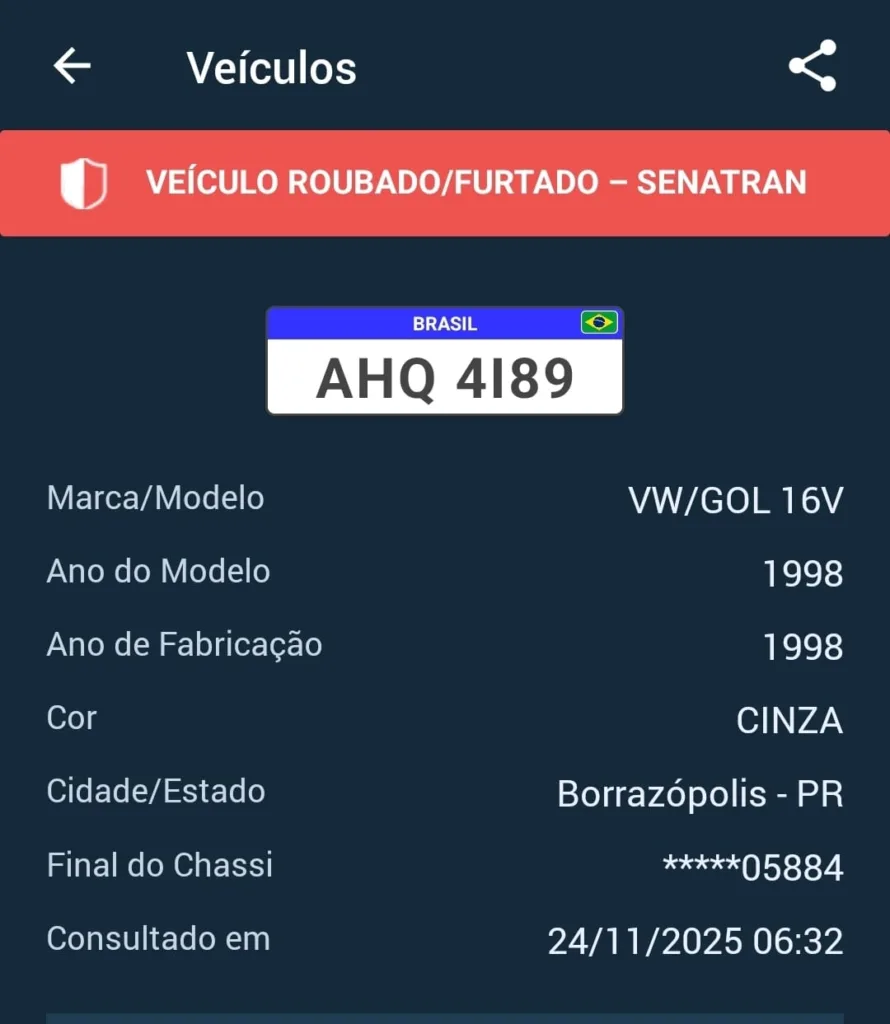 A Polícia Militar realizou buscas pela região, mas o automóvel não foi encontrado até o momento. Qualquer informação que ajude na recuperação do veículo pode ser repassada anonimamente pelo telefone 190 ou diretamente ao proprietário pelo (43) 99978-3929.