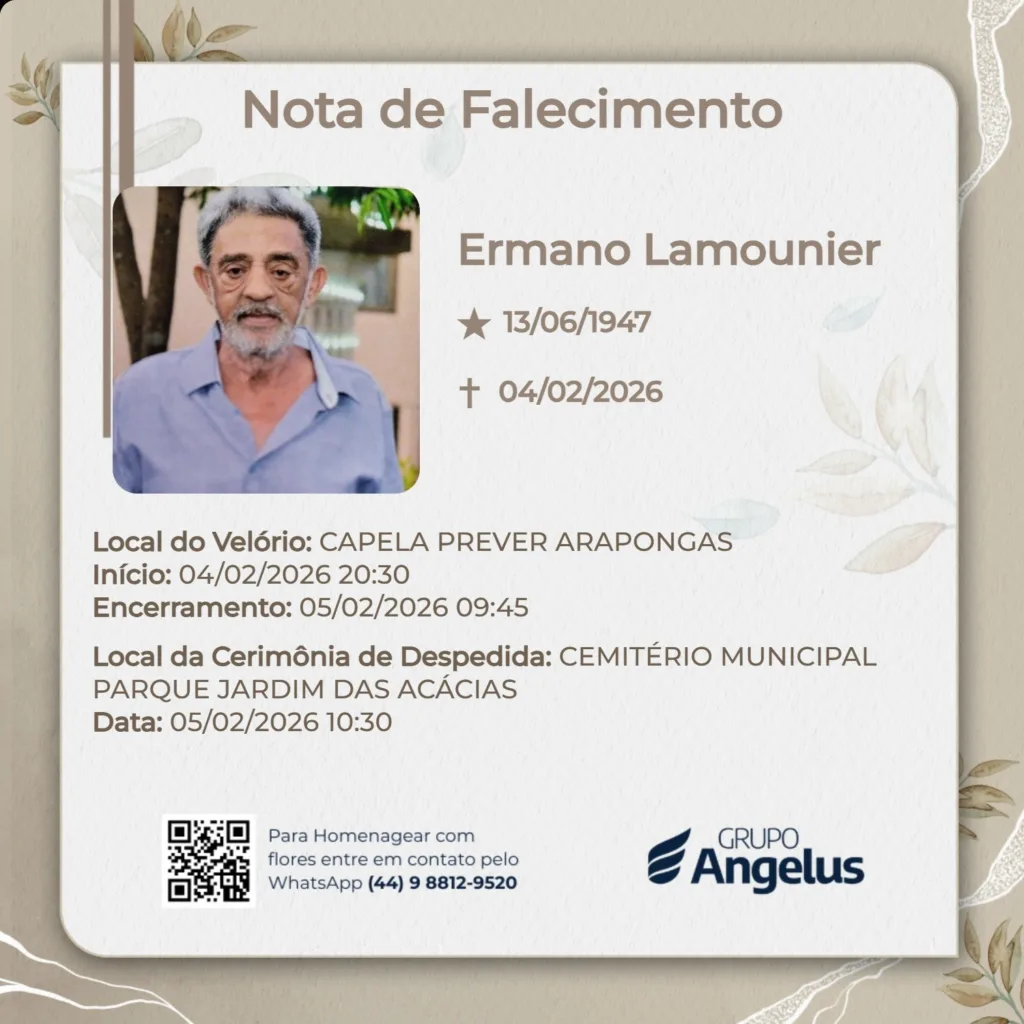 Faleceu na quarta-feira (4), aos 78 anos, Ermano Lamounier. O óbito foi registrado no Hospital Honpar II, em Arapongas.