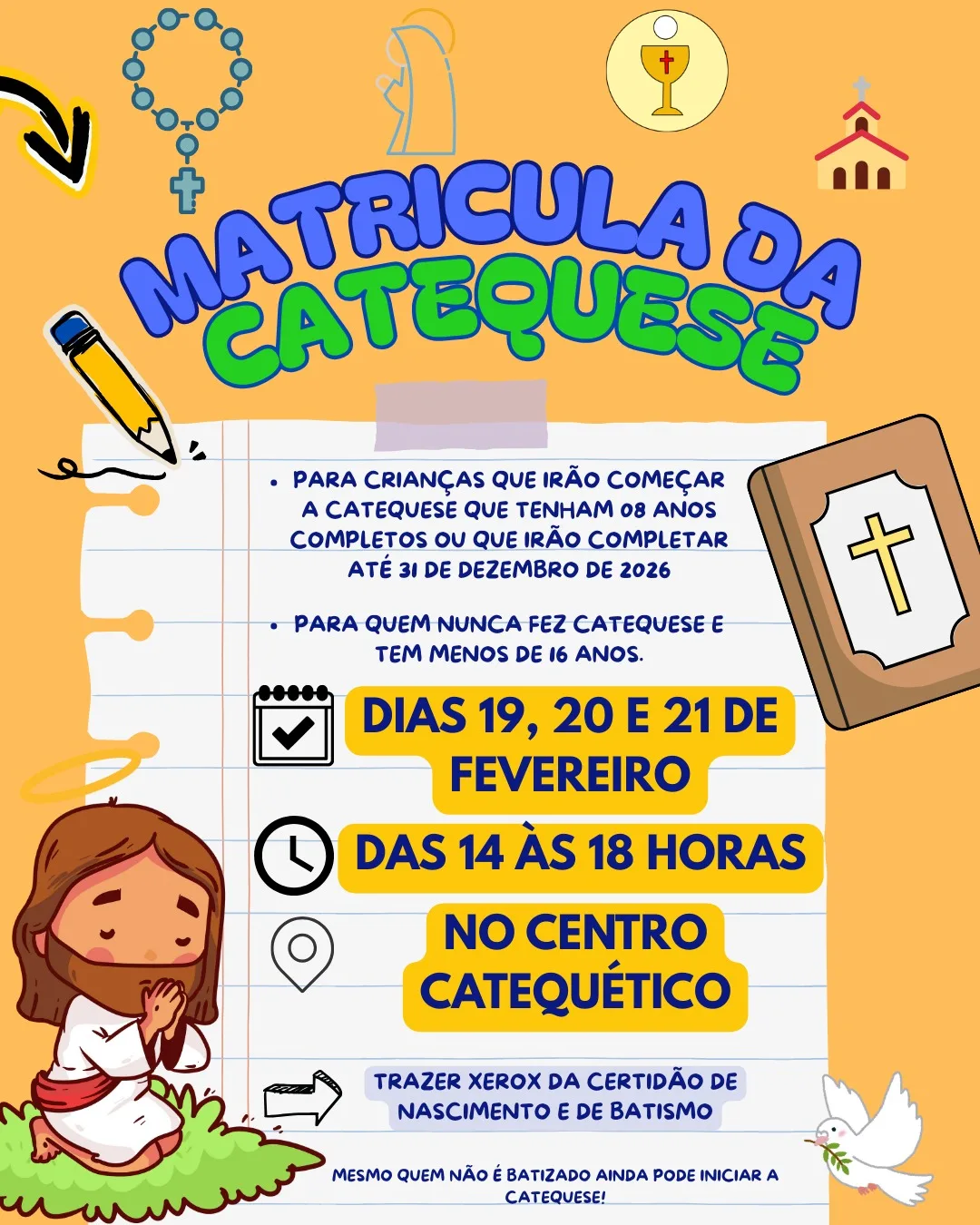 A Paróquia Imaculada Conceição, em Borrazópolis, divulgou as datas para as matrículas da Catequese 2026. As inscrições serão realizadas até o dia 21 de fevereiro, no Centro Catequético, das 14h às 18h.