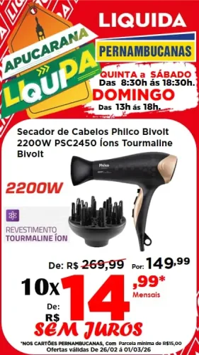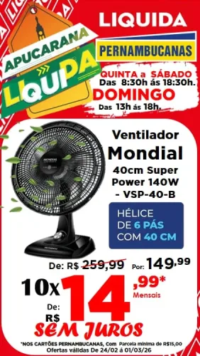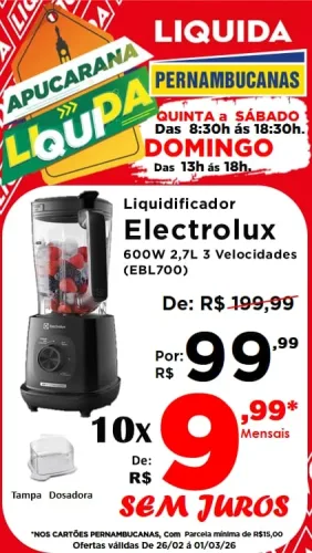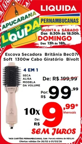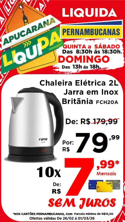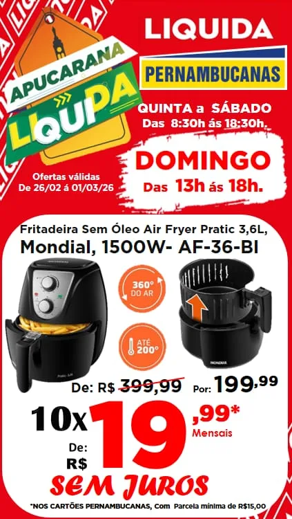 🚨 Atenção para os destaques: Promoção “Leve 4 e Pague 3” em produtos com etiqueta vermelha e uma seleção incrível de eletroportáteis em até 10x sem juros nos cartões Pernambucanas! Tem Air Fryer Mondial 3,6L por R$ 199,99; Escova Secadora Britânia ou Liquidificador Electrolux por apenas R$ 99,99 cada; Ventilador Mondial 40cm ou Secador de Cabelos Philco por R$ 149,99 cada; e Chaleira Elétrica 2L por R$ 79,99.