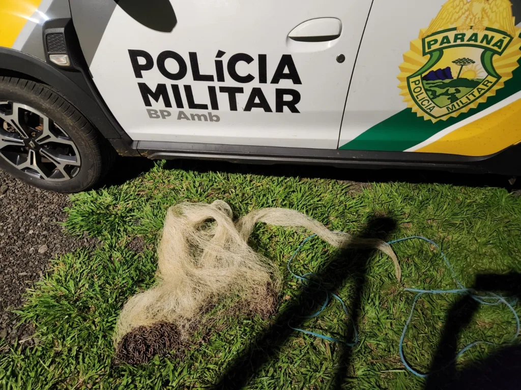 Uma tarrafa foi apreendida pela Polícia Militar Ambiental durante a Operação Carnaval 2026, na zona rural de Grandes Rios. A ação ocorreu no Rio Ivaí, na confluência com o Rio Branco, após denúncias de pesca predatória na região.