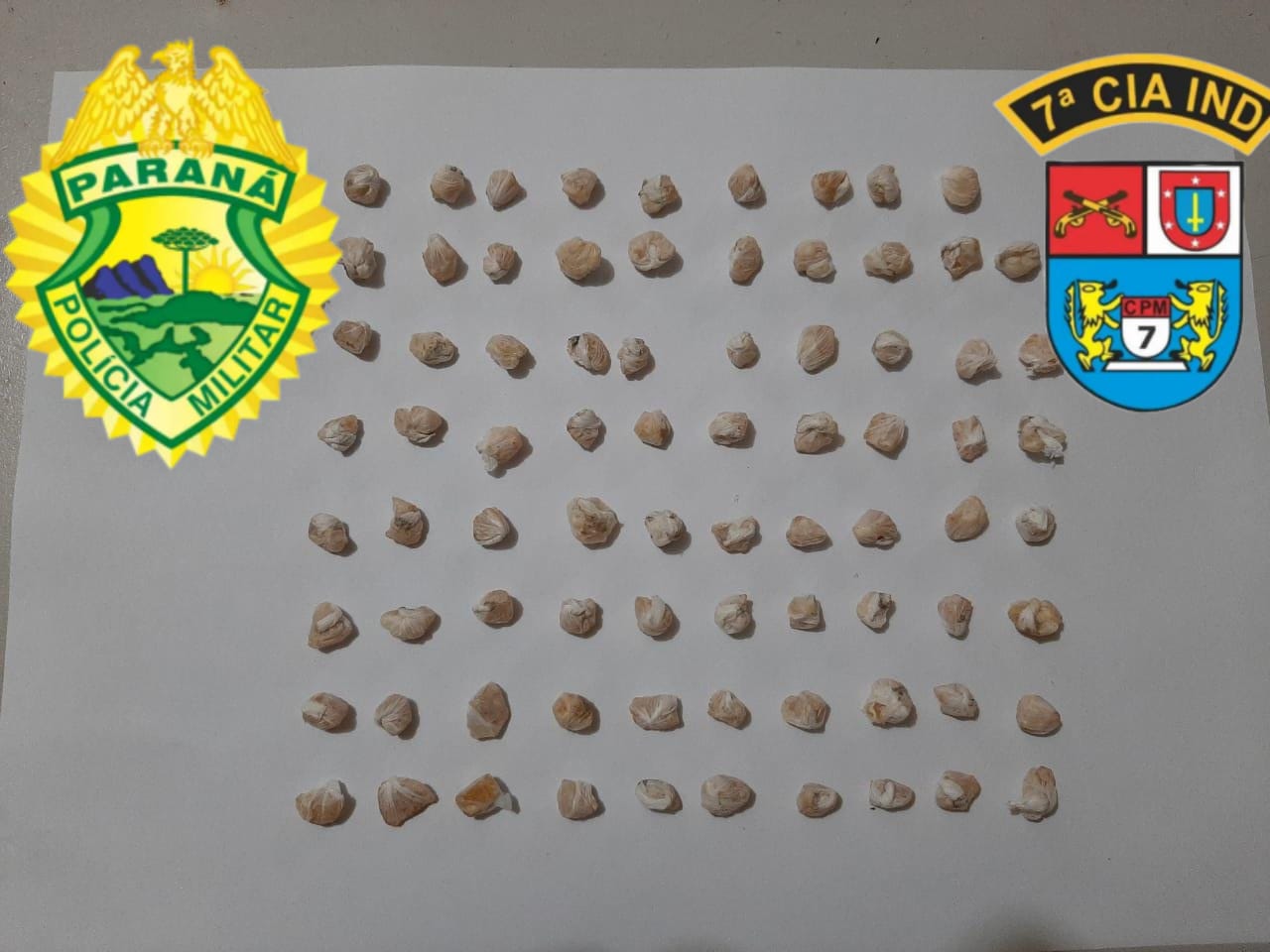 A equipe policial verificou que os dois invólucros continham no total, 79 “pedras” de crack, com peso de 17,56 gramas. O entorpecente estava embalado individualmente em sacola plástica branca, pronto para comercialização.