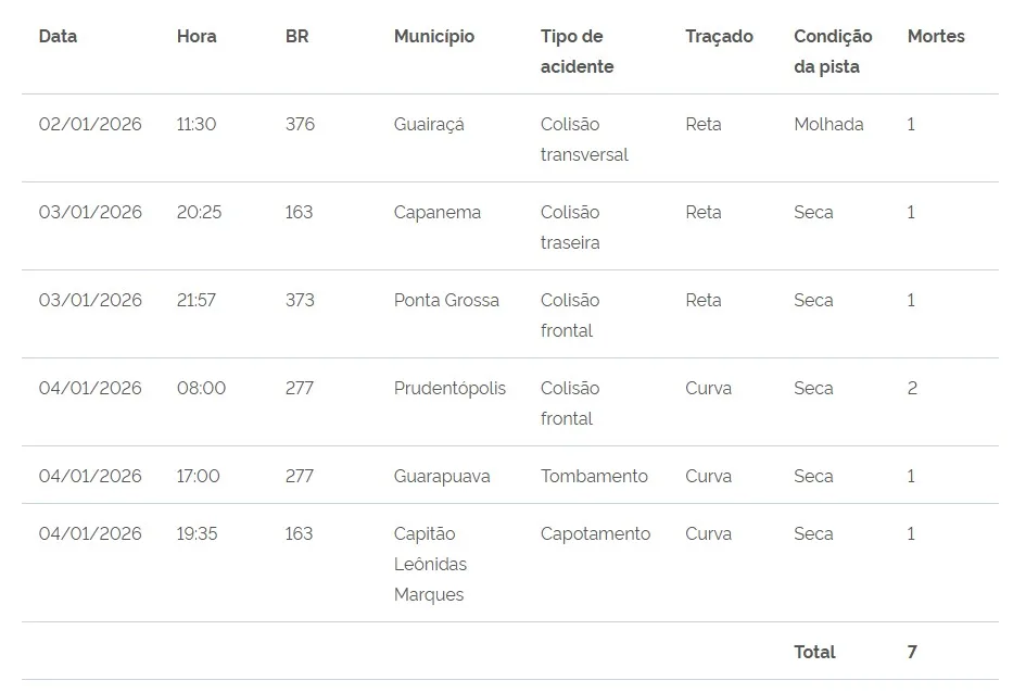 A Polícia Rodoviária Federal (PRF) divulgou o balanço da Operação Ano Novo 2026, realizada entre a terça-feira (30/12) e o domingo (04/01), nas rodovias federais do Paraná. Foram registrados 107 acidentes, que resultaram em 121 pessoas feridas e sete mortes.