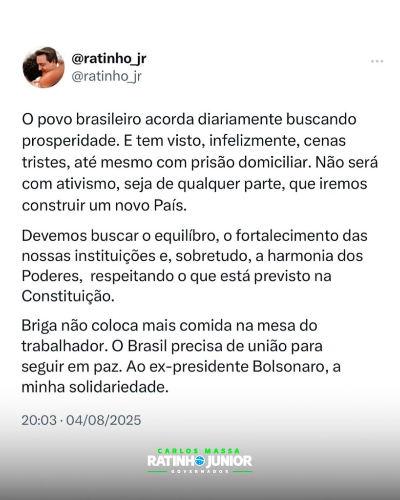 O governador concluiu a nota com um apelo pela pacificação nacional: “Briga não coloca mais comida na mesa do trabalhador. O Brasil precisa de união para seguir em paz. Ao ex-presidente Bolsonaro, a minha solidariedade.”