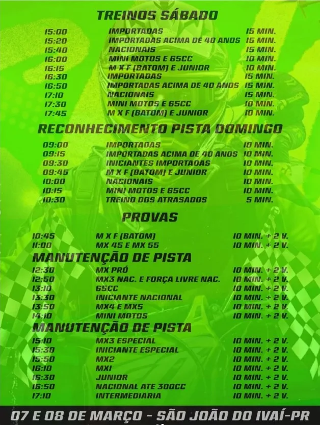 O município de São João do Ivaí será palco da 2ª etapa da Copa Paraná de Motocross nos dias 7 e 8 de março de 2026. O evento acontecerá no Centro de Eventos e deve reunir pilotos de diversas categorias, além de atrair público de toda a região.