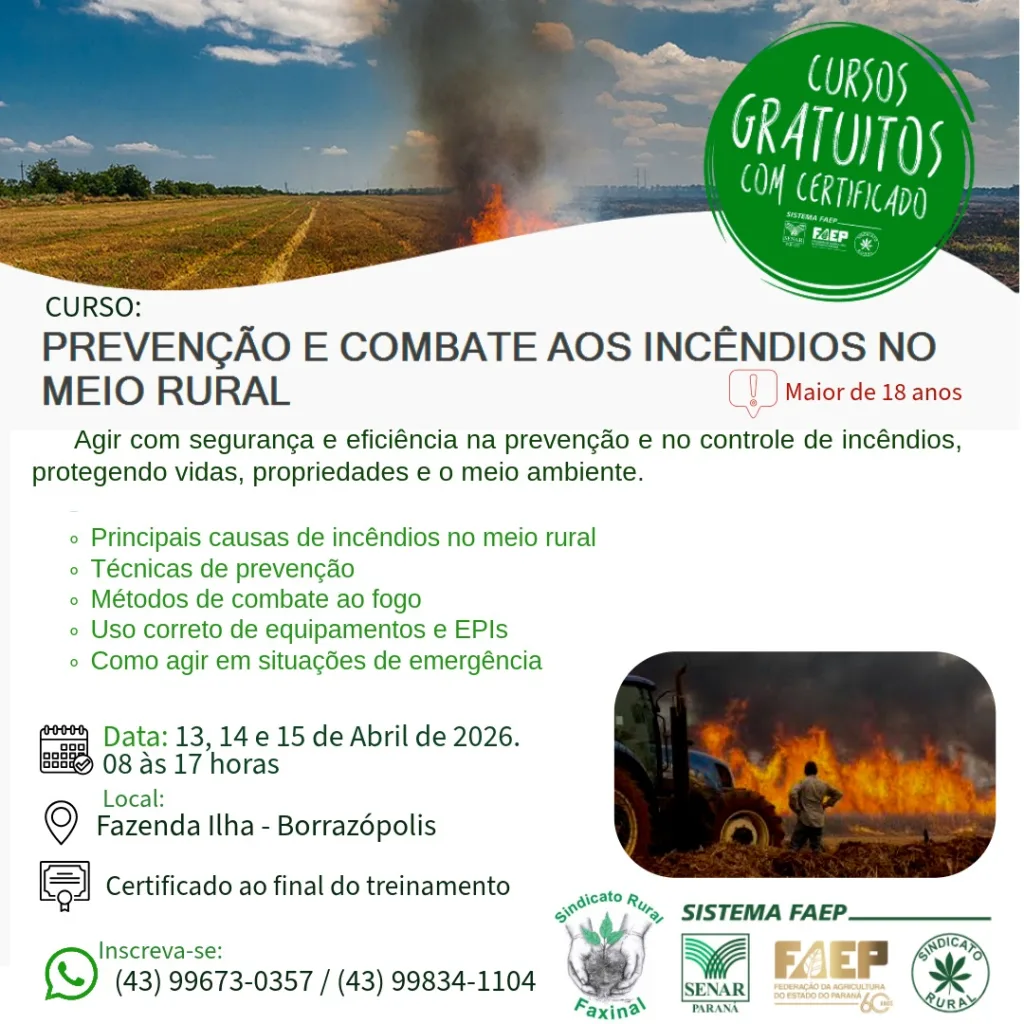 Na semana seguinte, ocorrem dois cursos simultâneos. De 13 a 15 de abril, das 08h às 17h, será realizado o curso de Prevenção e Combate aos Incêndios no Meio Rural, na Fazenda Ilha. O objetivo é capacitar os alunos para agir com segurança e eficiência, abordando as principais causas de incêndios, métodos de combate, uso de equipamentos e como agir em emergências. As inscrições são pelos números (43) 99673-0357 ou (43) 99834-1104.