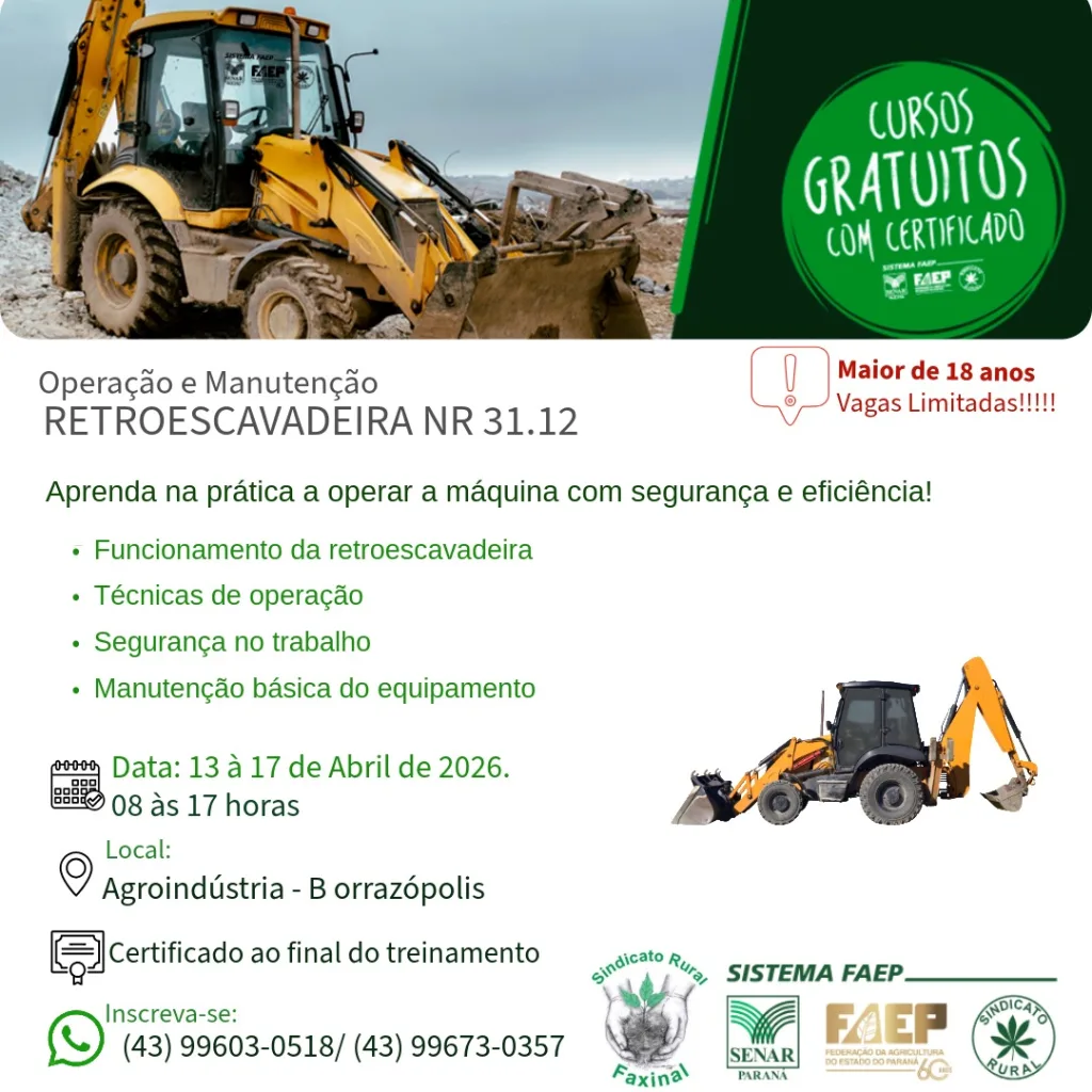 Também entre os dias 13 e 17 de abril, das 08h às 17h, a Agroindústria sediará o curso de Operação e Manutenção de Retroescavadeira NR 31.12. O treinamento prático focará no funcionamento da máquina, técnicas de operação, segurança no trabalho e manutenção básica. Para esta turma, os interessados devem se inscrever pelos telefones (43) 99603-0518 ou (43) 99673-0357.