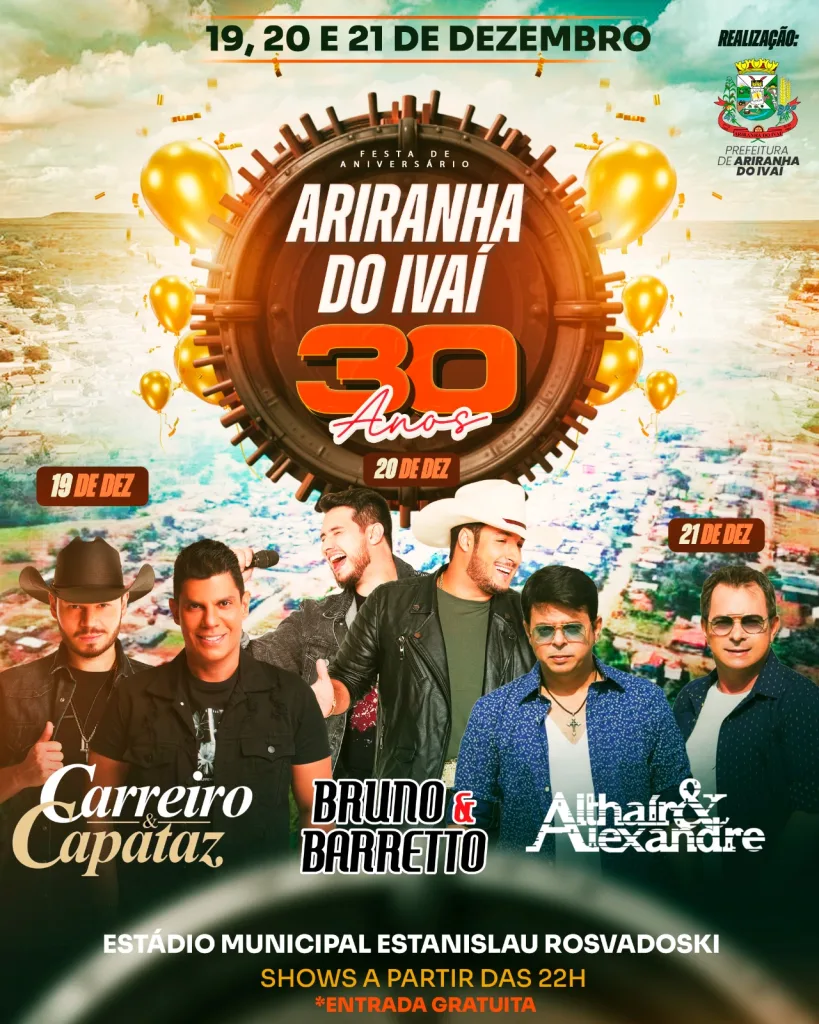Ariranha do Ivaí divulga programação de shows para comemorar 30 anos de emancipação 27 de novembro de 2025