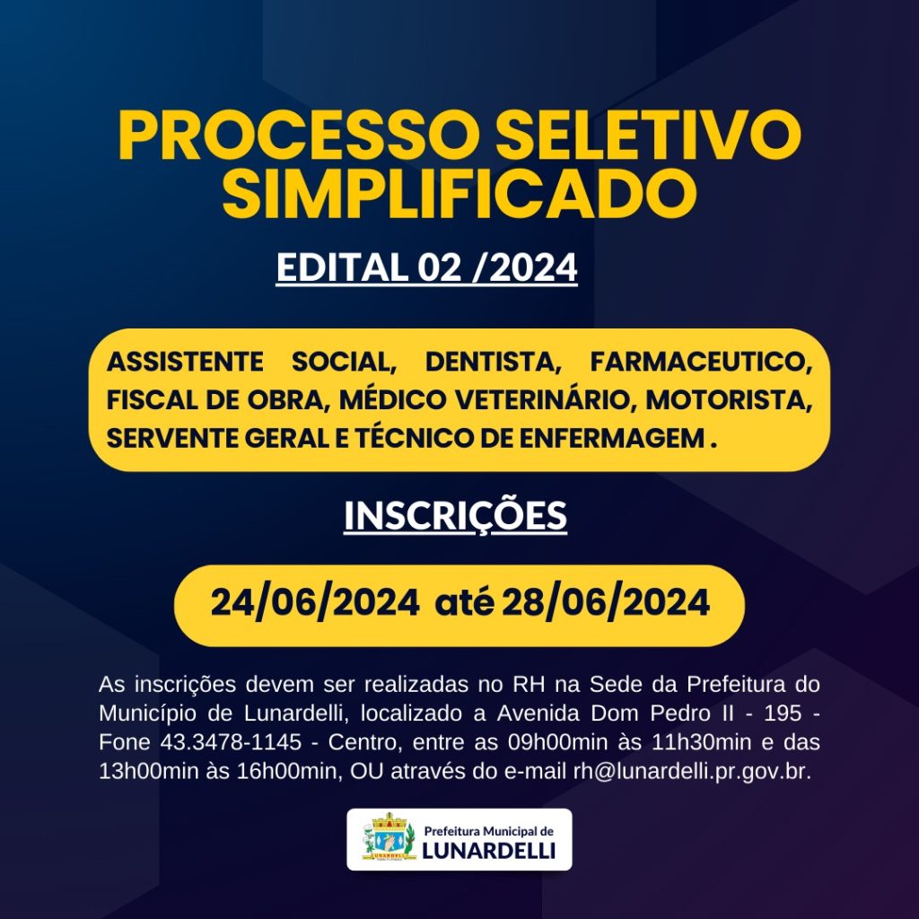 LUNARDELLI: Prefeitura divulga que se encontra aberta o edital para o Processo Seletivo Simplificado 27 de junho de 2024